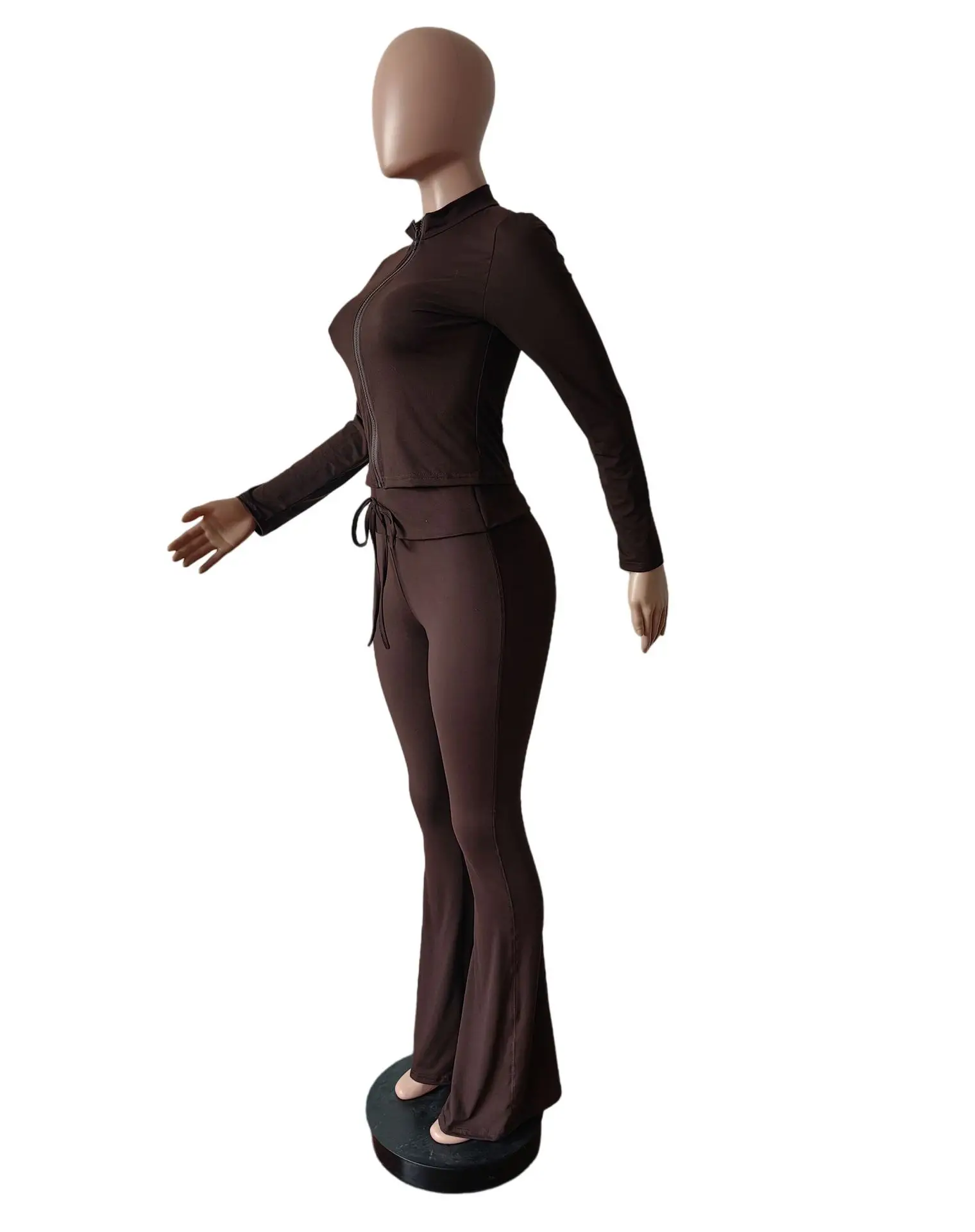 Joskaa Casual Sporty 2 Piece Sets Women Full Sleeve Zip Crop Tops and Drawstring Flare Pants Matching Tracksuits Streetwear